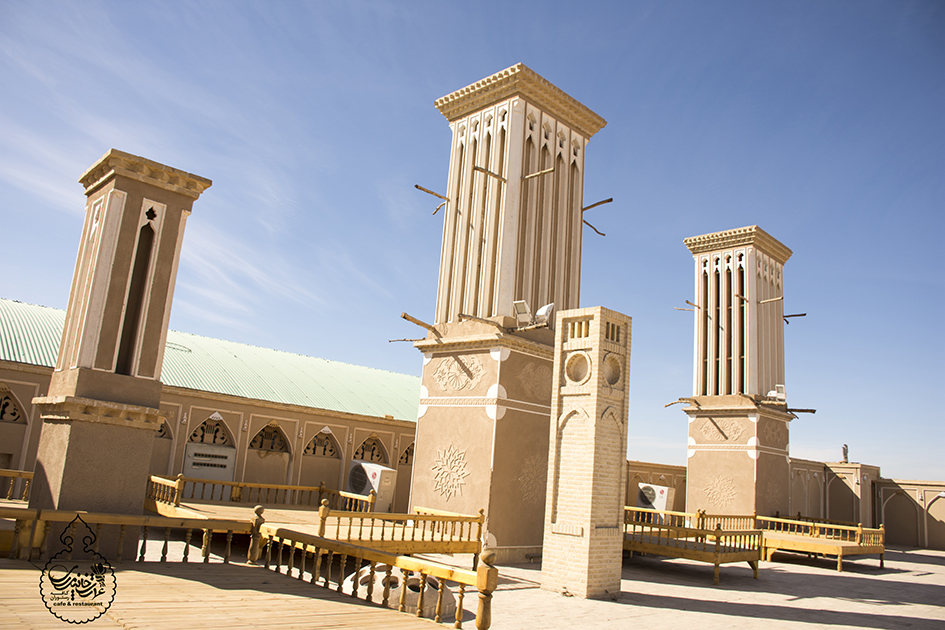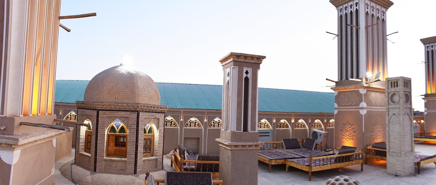 پشت بام این عمارت، بسیار وسیع و چشم اندازی بسیار زیبا از بافت تاریخی شهر جهانی یزد دارد. وجود پنج بادگیر در اندازه و ارتفاعات متفاوت و گچ بری و سیمگل و حصارکشی بسیار جذاب با کاربندی و قاب بندی های معروف به شاخ بزی و یک ایوان ویژه با گچ بری بسیار ظریف و ویژگی های خاص و پیکرتراشی چهار تن از پیامبران بزرگ ادیان الهی حضرت محمد(ص)، عیسی مسیح(ع)، نوح(ع) و موسی(ع) و گچ بری یکی از غزلیات مشهور لسان الغیب حافظ شیرازی مزین شده است.